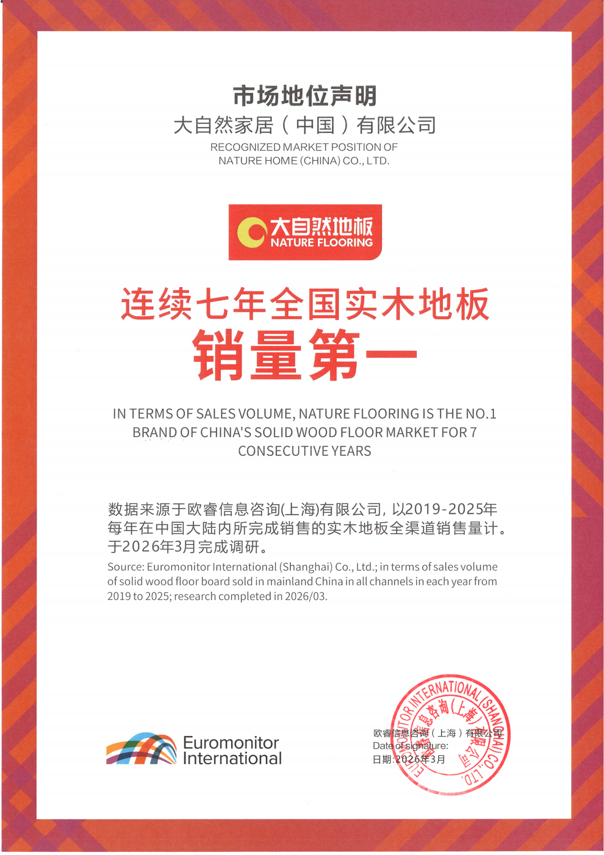3月10日,大自然家居新零售委員2026首屆盛會(huì)隆重舉辦,會(huì)上,國(guó)際權(quán)威調(diào)研機(jī)構(gòu)歐睿信息咨詢(上海)有限公司發(fā)布最新市場(chǎng)數(shù)據(jù):大自然地板2019-2025連續(xù)七年全國(guó)實(shí)木地板銷(xiāo)量第一。(數(shù)據(jù)來(lái)源于歐睿信息咨詢(上海)有限公司,以2019-2025年每年在中國(guó)大陸內(nèi)所完成銷(xiāo)售的實(shí)木地板全渠道銷(xiāo)售量計(jì)。于2026年2月完成調(diào)研)。