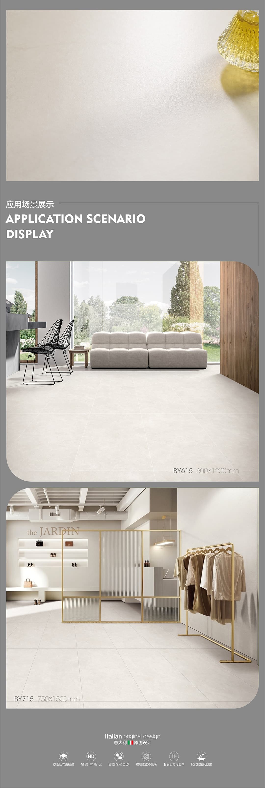 | 產(chǎn)品特性 | 表面柔和,防污效果強(qiáng),防滑R10指標(biāo)高,抗折強(qiáng)度好 |